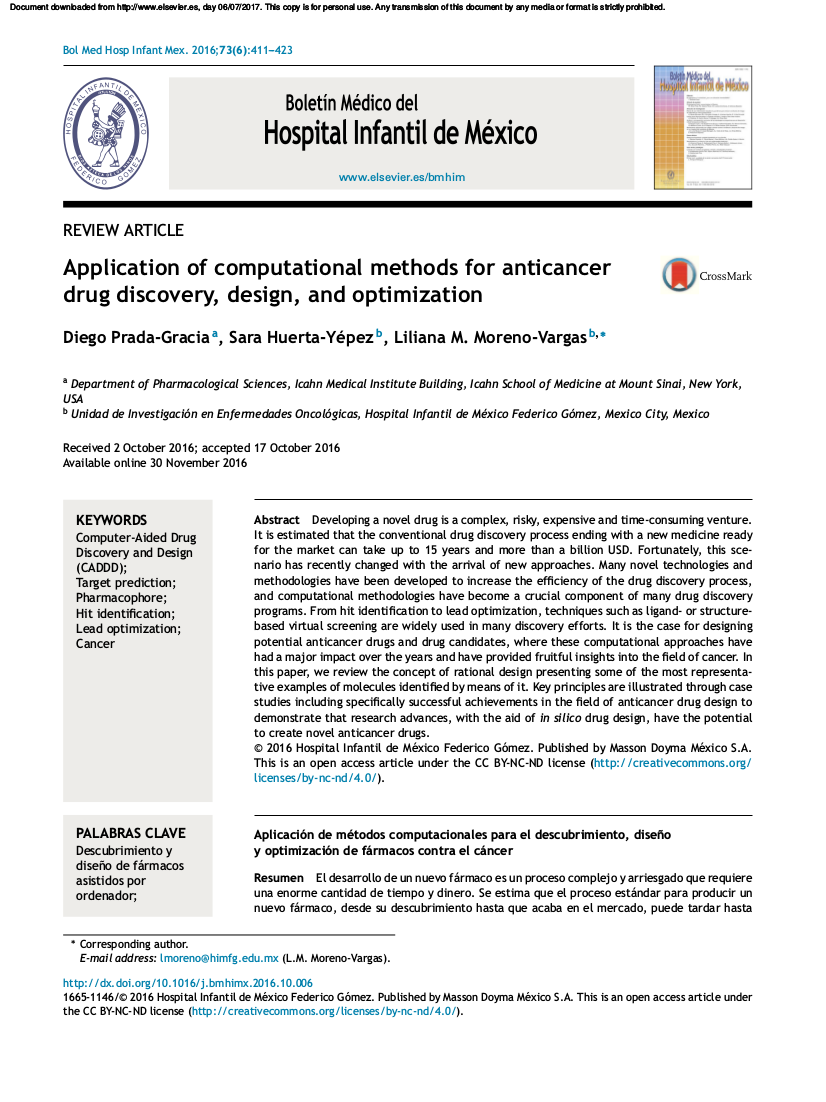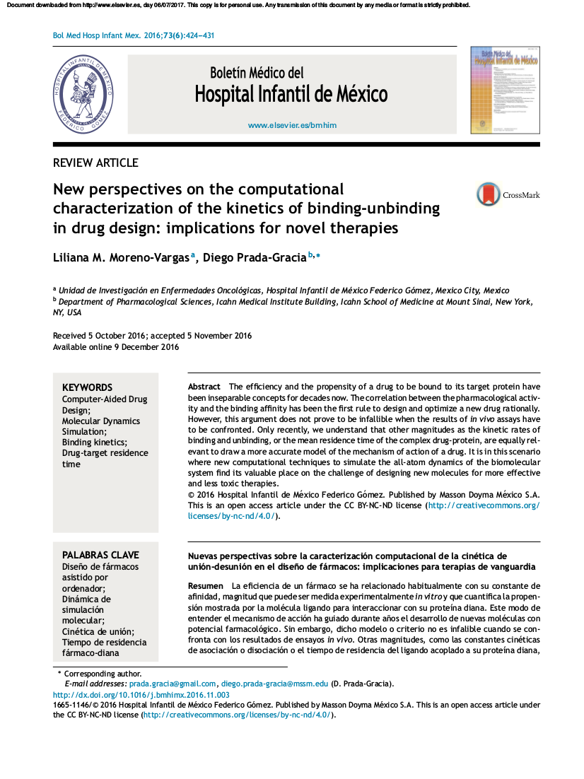 Also available in: Español Computational Biology and Drug Design Research Unit At the Mexico City Children's Hospital Federico Gómez tweets by @uibcdf We are currently reading: Last Papers: "Ligand recognition properties of the vasopressin V2 receptor studied under QSAR and molecular modeling strategies." Marlet Martínez-Archundia, Brenda Colín-Astudillo, Liliana M. Moreno-Vargas, ..., José Correa-Basurto. Chem Biol Drug Des 2017;00:1–14. "Application of computational methods for anticancer drug discovery, design, and optimization." Diego Prada-Gracia, Sara Huerta-Yépez, Liliana M. Moreno-Vargas. Bol Med Hosp Infant Mex 2016;73:411-23 "New perspectives on the computational characterization of the kinetics of binding-unbinding in drug design: implications for novel therapies." Liliana M. Moreno-Vargas, Diego Prada-Gracia. Bol Med Hosp Infant Mex 2016;73:424-31 Calendar: Thanks to: